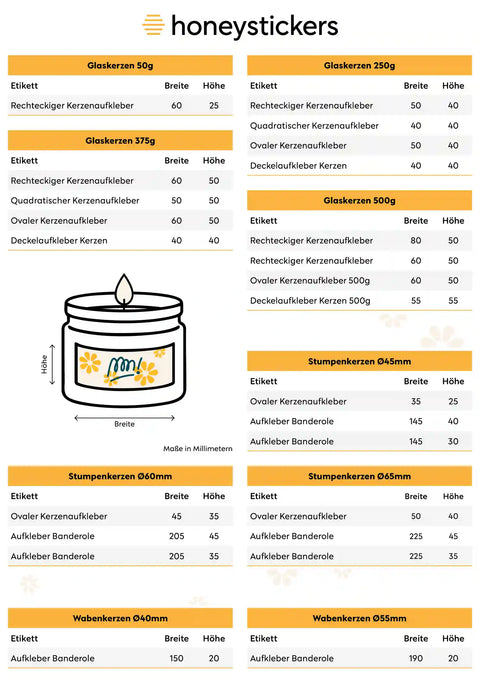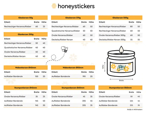 Für diese besondere Art von Kerzen bieten wir dir eine Auswahl an Etiketten, die speziell für die gängigsten Honigglasgrößen entworfen wurden. Egal ob du 50g, 250g, 375g oder 500g Gläser verwendest, wir haben die passenden Aufkleber für dich.